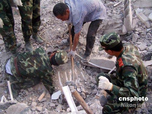 5月12日下午,四川汶川發(fā)生7.8級地震,導致重慶梁平縣文化鎮(zhèn)中心小學坍塌,武警重慶總隊梁平縣中隊官兵在中隊指導員唐兵的帶領(lǐng)下緊急趕赴現(xiàn)場展開搜救。經(jīng)過官兵們連續(xù)6個小時的艱苦奮戰(zhàn),從廢墟中成功救出11名師生。(李剛、陳萬金、秦龍兵攝影報道)
