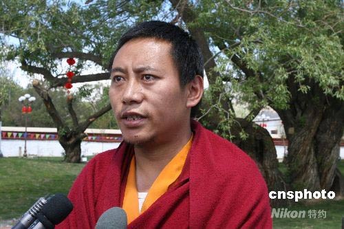 四川汶川大地震發(fā)生后,引起西藏宗教界極大關(guān)注,5月13日,拉薩哲蚌寺部分僧人代表在參觀(guān)完“三·一四”暴力事件中被燒毀的拉薩市第二中學(xué)教學(xué)樓、被毀店鋪和新改近造完工的羅布林卡廣場(chǎng)等處后表示,明天該寺將舉行主題祈福法會(huì),為四川汶川地震災(zāi)區(qū)民眾祈福。圖為僧人平措塔青在祝福災(zāi)區(qū)民眾。中新社發(fā) 柳俊武 攝