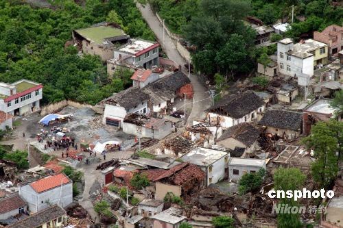 5月14日,空中拍攝的汶川縣城一角。成都軍區(qū)某陸航團四架直升機滿載帳篷、礦泉水等災區(qū)急需物資抵達四川大地震震中汶川縣,并在返回時將第一批40名重傷員隨機送抵成都的醫(yī)院救治。中新社發(fā) 張雷 黃龍 攝