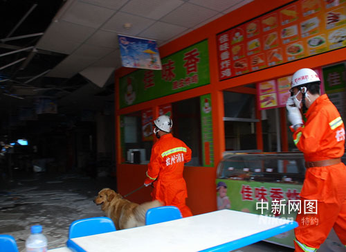 今天,浙江消防搶險(xiǎn)救援隊(duì)進(jìn)行四川地震災(zāi)區(qū)現(xiàn)場(chǎng),圖為搶險(xiǎn)救援隊(duì)帶領(lǐng)搜救犬進(jìn)入現(xiàn)場(chǎng)搜救。作 者:李玉飛