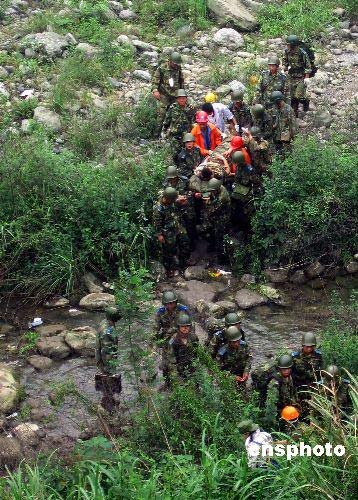 16日上午,師政治部主任高鵬帶領(lǐng)救援突擊隊和醫(yī)療小分隊172人,從綿竹市漢旺鎮(zhèn)出發(fā)向重災(zāi)區(qū)天池鄉(xiāng)幾個村里運送救援物資,幫助群眾撤離震區(qū)。11時左右,當(dāng)部隊行至高橋以西500米處,突然發(fā)生余震,導(dǎo)致大量山石從山頂傾斜而下,直接威脅著正在這個路段通過的群眾。作訓(xùn)參謀祝紅杰突然發(fā)現(xiàn)一個孩子癱倒在石堆上,急忙上前搶抱他,孩子得救了,祝紅杰卻被亂石砸斷左腿,當(dāng)場倒地。作訓(xùn)參謀胡國才眼見一塊亂石砸向老人,極力將老人推到一邊,自己的頭部卻被亂石砸傷暈倒在地。同時,該團還有一名司務(wù)長和兩名戰(zhàn)士在救援中被泥石流砸傷…… 看到解放軍為救災(zāi)區(qū)群眾身負(fù)重傷,在現(xiàn)場的一些救災(zāi)志愿者迅即投入搶救部隊官兵的行動中。運送途中山路險峻,他們拉一把、推一把,爭先恐后出把力氣。擔(dān)負(fù)救援撤離群眾任務(wù)的重慶市高新區(qū)人民醫(yī)院的醫(yī)護人員聞訊后,一邊流著熱淚,一邊實施現(xiàn)場救護,為他們贏得了寶貴的救治時機……