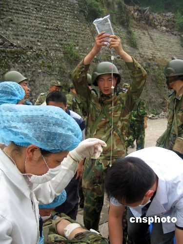 16日上午,師政治部主任高鵬帶領(lǐng)救援突擊隊和醫(yī)療小分隊172人,從綿竹市漢旺鎮(zhèn)出發(fā)向重災(zāi)區(qū)天池鄉(xiāng)幾個村里運送救援物資,幫助群眾撤離震區(qū)。11時左右,當(dāng)部隊行至高橋以西500米處,突然發(fā)生余震,導(dǎo)致大量山石從山頂傾斜而下,直接威脅著正在這個路段通過的群眾。作訓(xùn)參謀祝紅杰突然發(fā)現(xiàn)一個孩子癱倒在石堆上,急忙上前搶抱他,孩子得救了,祝紅杰卻被亂石砸斷左腿,當(dāng)場倒地。作訓(xùn)參謀胡國才眼見一塊亂石砸向老人,極力將老人推到一邊,自己的頭部卻被亂石砸傷暈倒在地。同時,該團(tuán)還有一名司務(wù)長和兩名戰(zhàn)士在救援中被泥石流砸傷…… 看到解放軍為救災(zāi)區(qū)群眾身負(fù)重傷,在現(xiàn)場的一些救災(zāi)志愿者迅即投入搶救部隊官兵的行動中。運送途中山路險峻,他們拉一把、推一把,爭先恐后出把力氣。擔(dān)負(fù)救援撤離群眾任務(wù)的重慶市高新區(qū)人民醫(yī)院的醫(yī)護(hù)人員聞訊后,一邊流著熱淚,一邊實施現(xiàn)場救護(hù),為他們贏得了寶貴的救治時機(jī)……