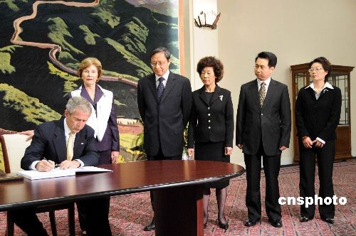 美國總統(tǒng)布什到中國駐美大使館悼念地震遇難者
