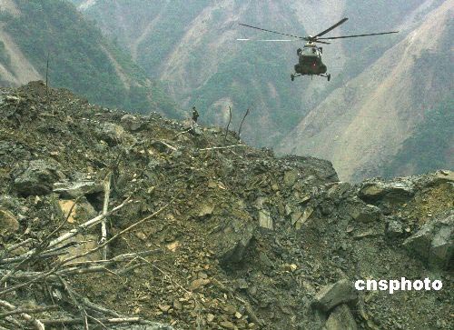 直升機(jī)成功強(qiáng)降北川堰塞湖塌方土堆上