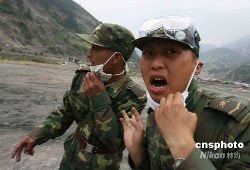 5月21日,又一次余震來襲,參加救援的解放軍士兵呼喊人們緊急避險(xiǎn)。中新社發(fā) 曾憲平 攝