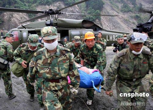 少數(shù)民族傷員正被解放軍通過(guò)直升機(jī)運(yùn)至救助點(diǎn)。中新社發(fā) 曾憲平 攝