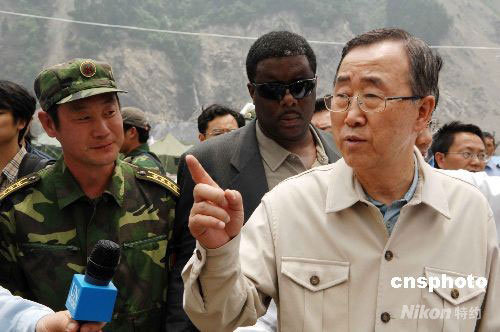 圖:聯(lián)合國(guó)秘書(shū)長(zhǎng)潘基文在映秀鎮(zhèn)察看地震災(zāi)情