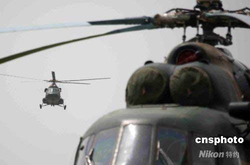 抗震救災(zāi)開始以來,中國軍方直升機(jī)連續(xù)向?yàn)?zāi)區(qū)輸送救災(zāi)物資。中新社發(fā) 曾憲平 攝