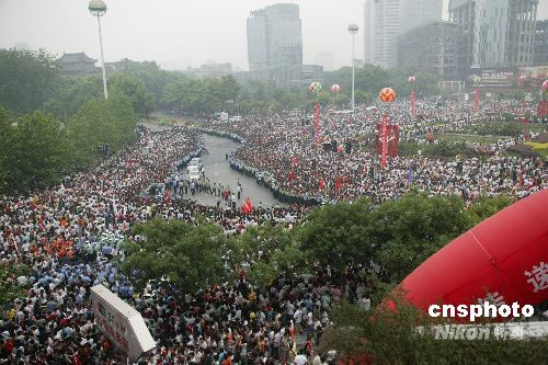 5月27日,奧運(yùn)火炬在南京傳遞,古城人山人海,歡迎祥云火炬的到來(lái)。中新社發(fā) 吳俊 攝