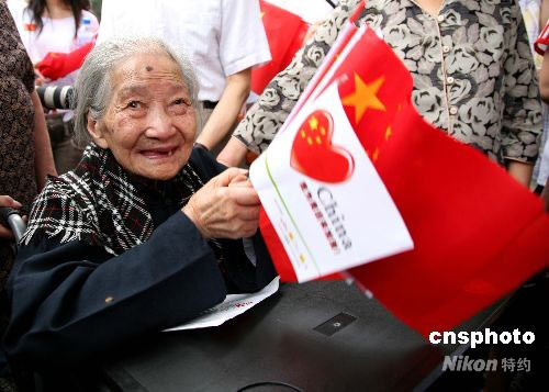 5月27日,奧運(yùn)會(huì)圣火在江蘇南京傳遞,112歲的胡家芝老人在家人的陪伴下,來(lái)到火炬?zhèn)鬟f現(xiàn)場(chǎng)南京市北京西路,與周?chē)娜罕娨坏罏榛鹁鎮(zhèn)鬟f加油。 中新社發(fā) 鐘山 攝