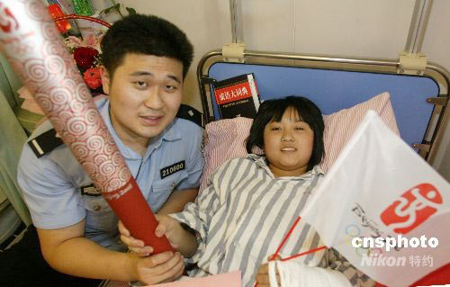 田野,是南京市公安局華僑路派出所的一名民警,也是北京奧運(yùn)會(huì)的火炬手。5月29日,他和他的同事帶著奧運(yùn)火炬來(lái)到江蘇省人民醫(yī)院愛(ài)心病房,看望6位在四川地震中受災(zāi)的孩子,讓他們近距離的看到了“祥云”火炬,并告訴他們?cè)诨鹁鎮(zhèn)鬟f中大家對(duì)災(zāi)區(qū)的祝愿。中新社發(fā) 吳俊 攝