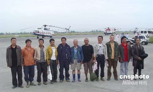 5月29日下午,被困17天的10名清平磷礦礦工,被民航直升機(jī)救出。剛走下飛機(jī)的被救礦工付學(xué)斌說,這17天來靠吃野菜和直升機(jī)空投的食品維持生命。5月12日那天,地震時(shí)他們都在磷礦上班,傷亡不是很大,主要是在家的親人都被這次地震給吞沒了。執(zhí)行這次營救任務(wù)的是中信海直的AS332型7961號和東方通用航空的米171型7856號飛機(jī)。據(jù)民航直升機(jī)抗震指揮部副總指揮關(guān)立欣講,受天氣影響,全天共出動(dòng)直升機(jī)10架次,執(zhí)行飛行任務(wù)24架次,運(yùn)進(jìn)救災(zāi)物資10.1噸,救援人員13人,接運(yùn)出被困群眾和傷員47人,財(cái)務(wù)檔案600公斤。中新社發(fā) 張鈺昱 攝