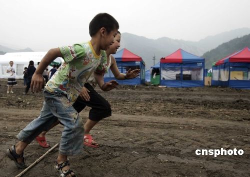 圖:劫后余生的孩子們?cè)跒?zāi)區(qū)空地上賽跑