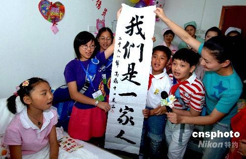 5月31日,來福州參加“海峽兩岸手拉手藝術(shù)節(jié)”的臺灣澎湖馬公小學(xué)音樂班的洪儀庭、許宜彙、林宏珍3位同學(xué)與福州小朋友,一起來到南京軍區(qū)福州總醫(yī)院愛心病房,與在這里接受治療的四川地震災(zāi)區(qū)的小朋友共同舉行一場別開生面的聯(lián)歡活動(dòng),提前歡度“六一”兒童節(jié)。中新社發(fā) 劉可耕 攝
