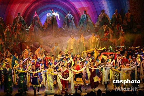 5月31日晚,西藏自治區(qū)文藝界舉行《幸福在路上》主題匯演,此系四川大地震后西藏首場大型演出,雪域兒女以吉祥哈達(dá)祝福祖國、祝福四川、祝福北京奧運(yùn)會(huì)。中新社發(fā) 賈長飛 攝