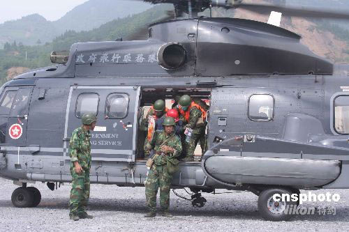 圖為香港特區(qū)政府飛行服務(wù)隊一架直升機(jī)載著獲救礦工降落在四川廣漢機(jī)場。中新社發(fā) 潘其武 攝