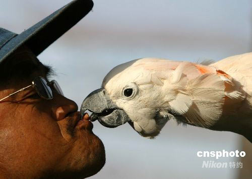2008年6月1日,在山東西霞口神雕山野生動物園百鳥園內,一只鸚鵡從一位老人嘴中搶食,這種人、鳥和睦共處有趣的絕技表演,吸引著眾多游客前來觀賞。中新社發(fā) 郭光耀 攝
