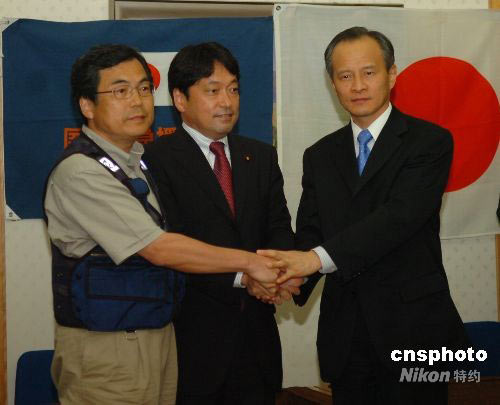 6月2日晚間,日本國際緊急援救隊(duì)結(jié)束為期兩周的在中國汶川地震災(zāi)區(qū)醫(yī)療援助活動(dòng)返回東京,受到中國駐日大使崔天凱等中國駐日使館官員、在日華人華僑留學(xué)生的熱烈歡迎。圖為崔天凱與前來迎接醫(yī)療隊(duì)歸國的日本外務(wù)副大臣小野寺五典(中)、醫(yī)療隊(duì)團(tuán)長(zhǎng)田尻和宏(左)。中新社發(fā) 朱沿華 攝