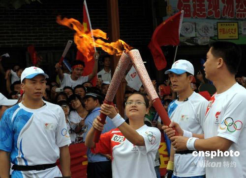 圖為22號火炬手點(diǎn)燃“祥云”火炬。中新社發(fā) 廖攀 攝