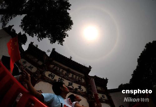 6月5日,奧運(yùn)圣火湖南傳遞在韶山結(jié)束后,天空出現(xiàn)日暈奇觀,毛氏宗祠前為圣火歡呼的人們仰望奇觀。 中新社發(fā) 廖攀 攝