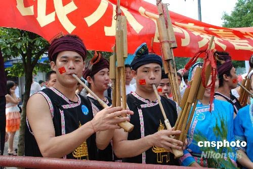 奧運圣火在桂林傳遞,來自桂林龍勝銀水侗寨的小伙子們吹起蘆笙,迎接奧運圣火的到來。中新社發(fā) 劉桂陽 攝