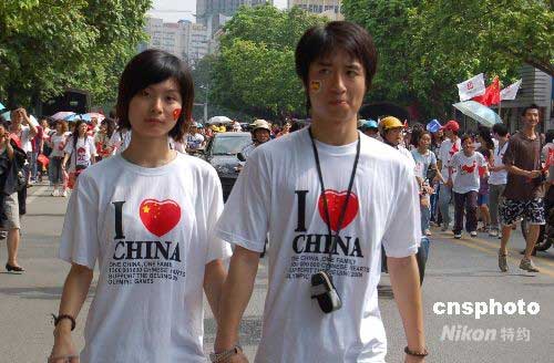一對年輕情侶牽手街頭迎接奧運圣火。中新社發(fā) 劉萬強 攝