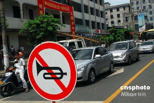 海口一高考點(diǎn)附近,交警部門(mén)設(shè)置的禁鳴喇叭標(biāo)識(shí)牌。中新社發(fā) 善平 攝