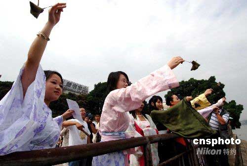 眾多身著傳統(tǒng)漢服的福建青年女子紛紛向閩江投粽子,端午時(shí)節(jié)祭悼屈原。中新社發(fā) 劉可耕 攝