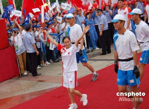 6月8日上午,北京奧運火炬在革命老區(qū)廣西百色平果縣進行傳遞,第一棒火炬手是平果縣希望小學校長、壯族姑娘周標亮,她曾受到鄧小平的資助。上世紀九十年代,鄧小平以“一個老共產黨員”的名義向希望工程捐款5000元,這筆捐款被落實到平果縣希望小學,使25名瀕臨失學的貧困學生得以繼續(xù)學業(yè),周標亮就是當年得到資助的學生之一。后來,這位壯族姑娘考取了一所師范學校,畢業(yè)后她回到培養(yǎng)自己的平果縣希望小學任教,2005年被任命為該校校長。中新社發(fā) 劉萬強 攝