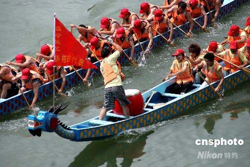 六月八日上午,在福建武夷山城中的崇陽溪上,兩只龍舟你追我趕。當天是中國傳統(tǒng)節(jié)日端午節(jié),福建武夷山舉辦民俗活動龍舟賽迎接節(jié)日到來。中新社發(fā) 周文杰 攝