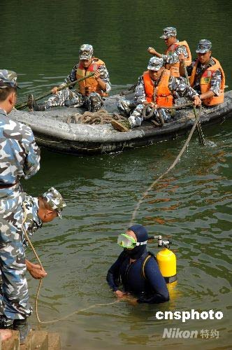 6月9日上午,應(yīng)當(dāng)?shù)卣埱,海軍陸?zhàn)隊某旅兩棲偵察隊官兵前往四川省綿竹市遵道鎮(zhèn)太平水庫,采用疏通水庫水下臥管式放水口的方式,對其進(jìn)行排水減壓。經(jīng)過4名潛水員近2個小時的連續(xù)作業(yè),終于將水庫最底下的2個放水口拉開。汶川特大地震導(dǎo)致四川省綿竹市遵道鎮(zhèn)的太平水庫大壩出現(xiàn)多處裂縫,汛期將至,如果不及時實施排水減壓,下游的數(shù)千村民和萬畝農(nóng)田可能面臨被淹的威脅。 中新社發(fā) 李唐 攝