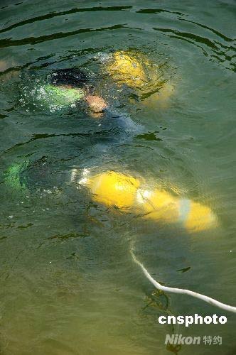 經(jīng)過4名潛水員近2個小時的連續(xù)作業(yè),終于將水庫最底下的2個放水口拉開。中新社發(fā) 李唐 攝