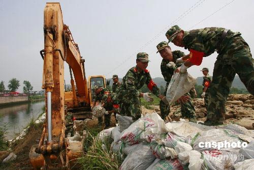 6月10日中午,四川省遂寧市遂寧軍分區(qū)、武警遂寧市支隊、遂寧消防組織的數百名參戰(zhàn)官兵正在加緊筑壩,以截斷唐家山堰塞湖污水流入遂寧市城區(qū),保衛(wèi)遂寧40余萬人的生活飲用水源不被污染。當天上午,據唐家山堰塞湖排險水情測報指揮中心消息,唐家山堰塞湖泄流槽水勢較猛,下游水位增長較快。中新社發(fā) 鐘 敏 攝