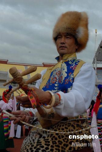 圖為當?shù)夭刈迕癖姎g迎圣火來到香格里拉。 中新社發(fā) 石雨 攝