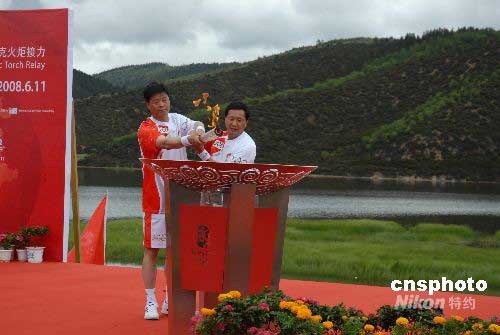 6月11日11時(shí),奧運(yùn)圣火香格里拉傳遞的最后一棒由香格里拉縣委書記彭耀文(左)和中國著名長(zhǎng)跑運(yùn)動(dòng)員張國偉共同完成,祥云圣火在普達(dá)措國家公園完成香格里拉最后的傳遞線路。隨后兩名火炬手在屬都湖邊點(diǎn)燃圣火盆,奧運(yùn)圣火傳遞香格里拉站圓滿結(jié)束。
