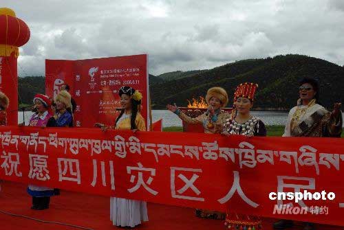 奧運(yùn)圣火在云南香格里拉傳遞,在結(jié)束儀式現(xiàn)場,全場共同高歌《一個(gè)媽媽的女兒》,為四川災(zāi)區(qū)人民祝福。 中新社發(fā) 石雨 攝