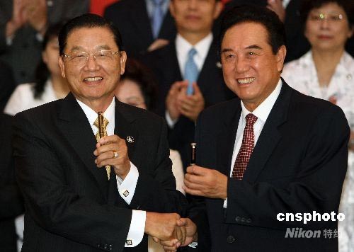 峽兩岸關(guān)系協(xié)會(huì)會(huì)長(zhǎng)陳云林(右)與臺(tái)灣海峽交流基金會(huì)董事長(zhǎng)江丙坤在簽署“兩岸周末包機(jī)”和“大陸居民赴臺(tái)旅游”協(xié)議后,交換簽字筆。中新社發(fā) 任晨鳴 攝