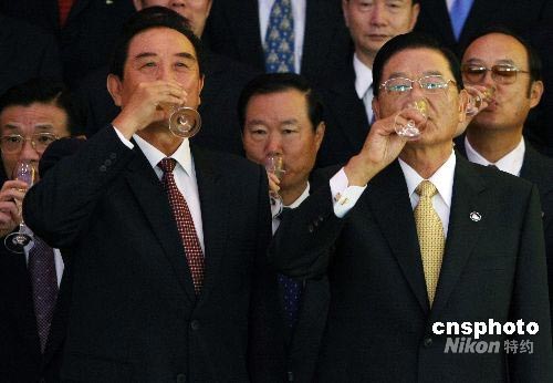 海峽兩岸關(guān)系協(xié)會會長陳云林(右)與臺灣海峽交流基金會董事長江丙坤在簽署“兩岸周末包機”和“大陸居民赴臺旅游”協(xié)議后,共飲“慶功酒”。中新社發(fā) 任晨鳴 攝