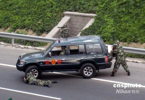13日,中國“長城5號”國家級反恐怖演習(xí)科目之一的處置劫持人質(zhì)事件,在人員入出境最頻繁的北京首都國際機(jī)場附近進(jìn)行。演習(xí)過程中,三輛運(yùn)動(dòng)員班車行至首都機(jī)場高速北線某橋面時(shí),被兩輛面包車阻停,“恐怖分子”將車上人員劫為人質(zhì)。中新社發(fā) 于立霄 攝
