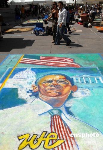 一幅憧憬奧巴馬入主白宮的巨型粉筆畫吸引觀眾。中新社發(fā) 張煒 攝