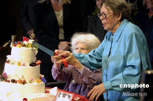 女同性戀者八十七歲的德爾·馬丁(左)和八十四歲的菲莉斯·里昂(右),在相愛五十五年后,終于領(lǐng)取了結(jié)婚證書。中新社發(fā) 陳鋼 攝