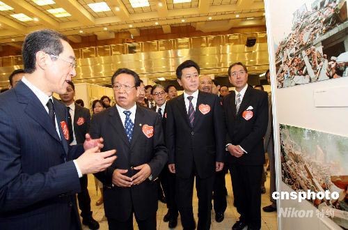 圖為香港署理行政長(zhǎng)官唐英年(左)、中聯(lián)辦副主任李剛(右二)、大公報(bào)社長(zhǎng)王國(guó)華(左二)等在主持開(kāi)幕式后觀看圖片展。