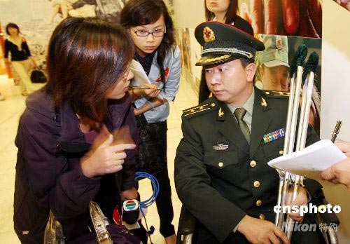 “大愛無疆—汶川大地震抗震救災圖片展”在香港展覽中心展出,大會邀請到抗震救災第一線的英雄成都軍區(qū)的鐘良軍在開幕式上作報告。中新社發(fā) 洪少葵 攝