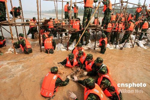 6月18日,山東省軍區(qū)和濟南警備區(qū)在濟南西郊玉清湖附近黃河大堤舉行大型防汛搶險演練。來自濟南市的10支民兵預(yù)備役部隊、黃河專業(yè)搶險隊等共1300余名隊員演練了水情偵察、封堵決口、爆破分洪、管涌搶護(hù)、堤壩搶護(hù)、緊急營救、搶筑子堤等七項防汛搶險科目。中新社發(fā) 周青先 攝