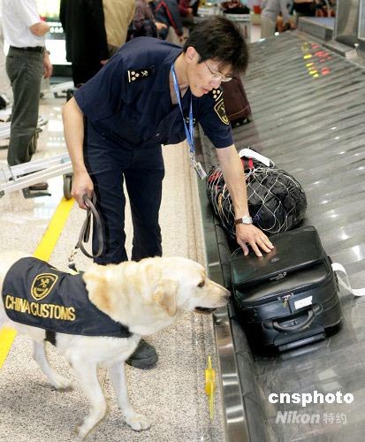 北京海關(guān)旅檢、緝私部門等近日在首都機(jī)場(chǎng)聯(lián)合進(jìn)行奧運(yùn)安保綜合演練,考察一線關(guān)員處置突發(fā)事件的應(yīng)變能力。圖為搜爆犬在機(jī)場(chǎng)行李中查緝爆炸物品。 中新社發(fā) 雷虹 攝