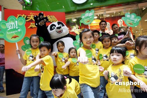 六月十九日,香港一服飾連鎖店推出動(dòng)畫電影《功夫熊貓》服飾系列,一群穿著功夫服飾的小朋友與功夫熊貓“阿寶”登場造勢。中新社發(fā) 洪少葵 攝