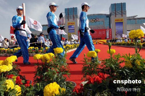 6月22日,北京奧運火炬開始在青海省格爾木市的傳遞,今早九時,火炬接力起跑儀式在格爾木市鹽湖廣場進(jìn)行,圣火護(hù)衛(wèi)手捧圣火火種步入儀式現(xiàn)場。中新社發(fā) 廖攀 攝