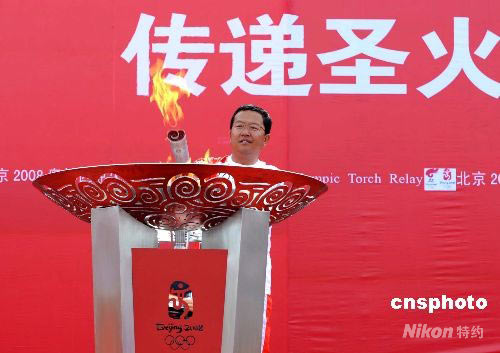 6月22日10時(shí)42分,末棒火炬手——“全國(guó)十大杰出青年”李小松在格爾木中心廣場(chǎng)點(diǎn)燃圣火盆,北京奧運(yùn)火炬接力格爾木站傳遞活動(dòng)圓滿(mǎn)結(jié)束。中新社發(fā) 廖攀 攝