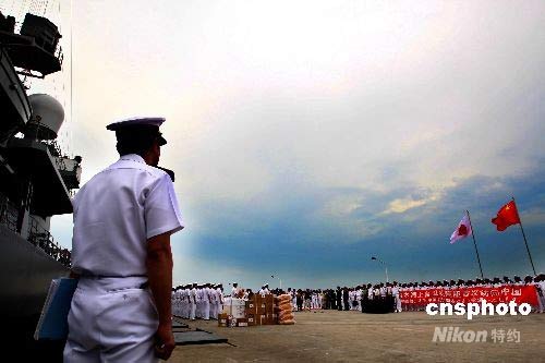 中國(guó)人民解放軍海軍官兵歡迎日本"漣"號(hào)艦艇訪華