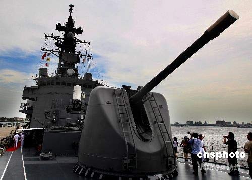 日本艦艇“漣”號到達湛江軍港后,中日記者應(yīng)邀到“漣”號上參觀采訪。中新社發(fā) 宋吉河 攝